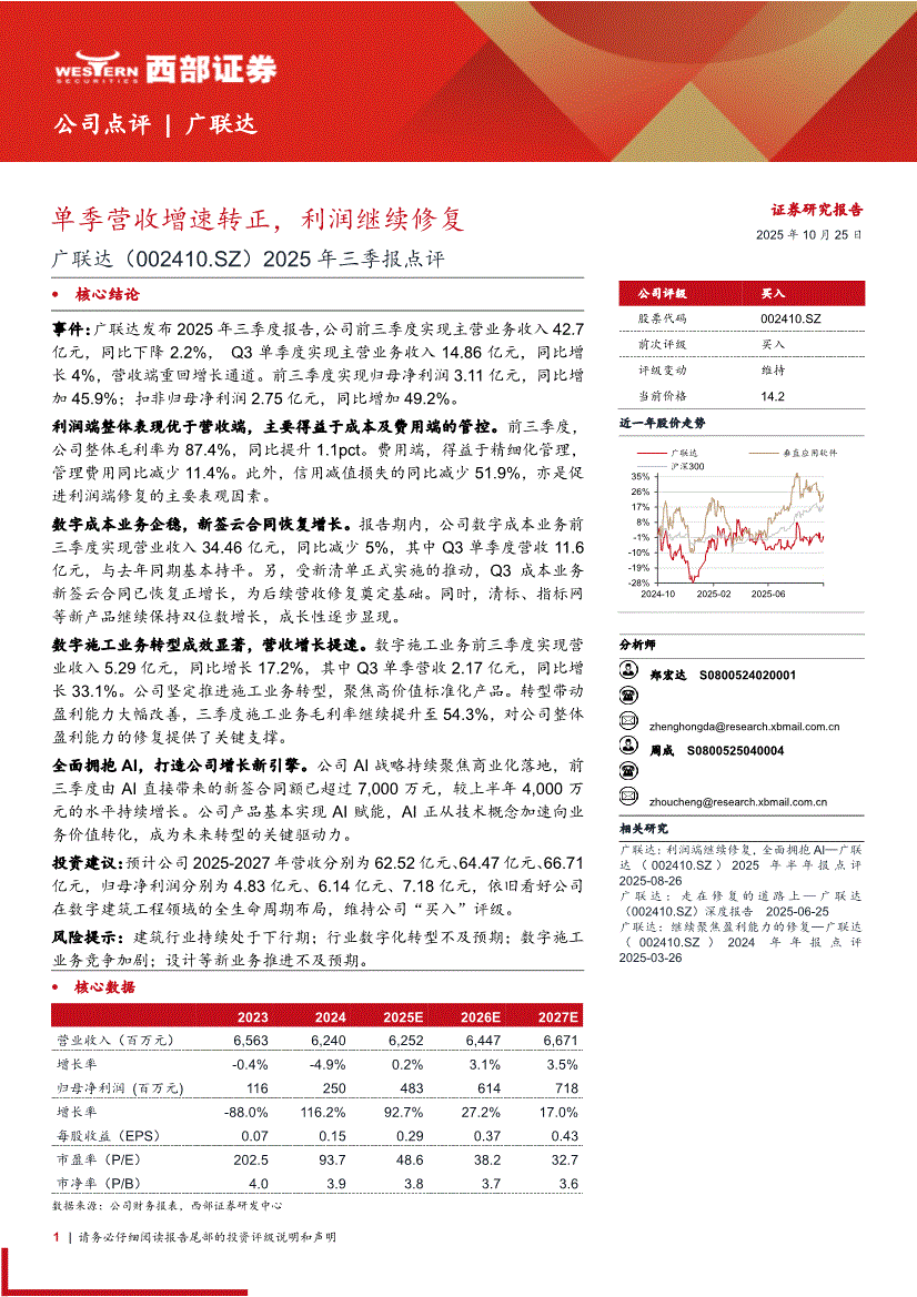广联达:西部证券-广联达-002410-2025年三季报点评:单季营收增速转正,利润继续修复-251025