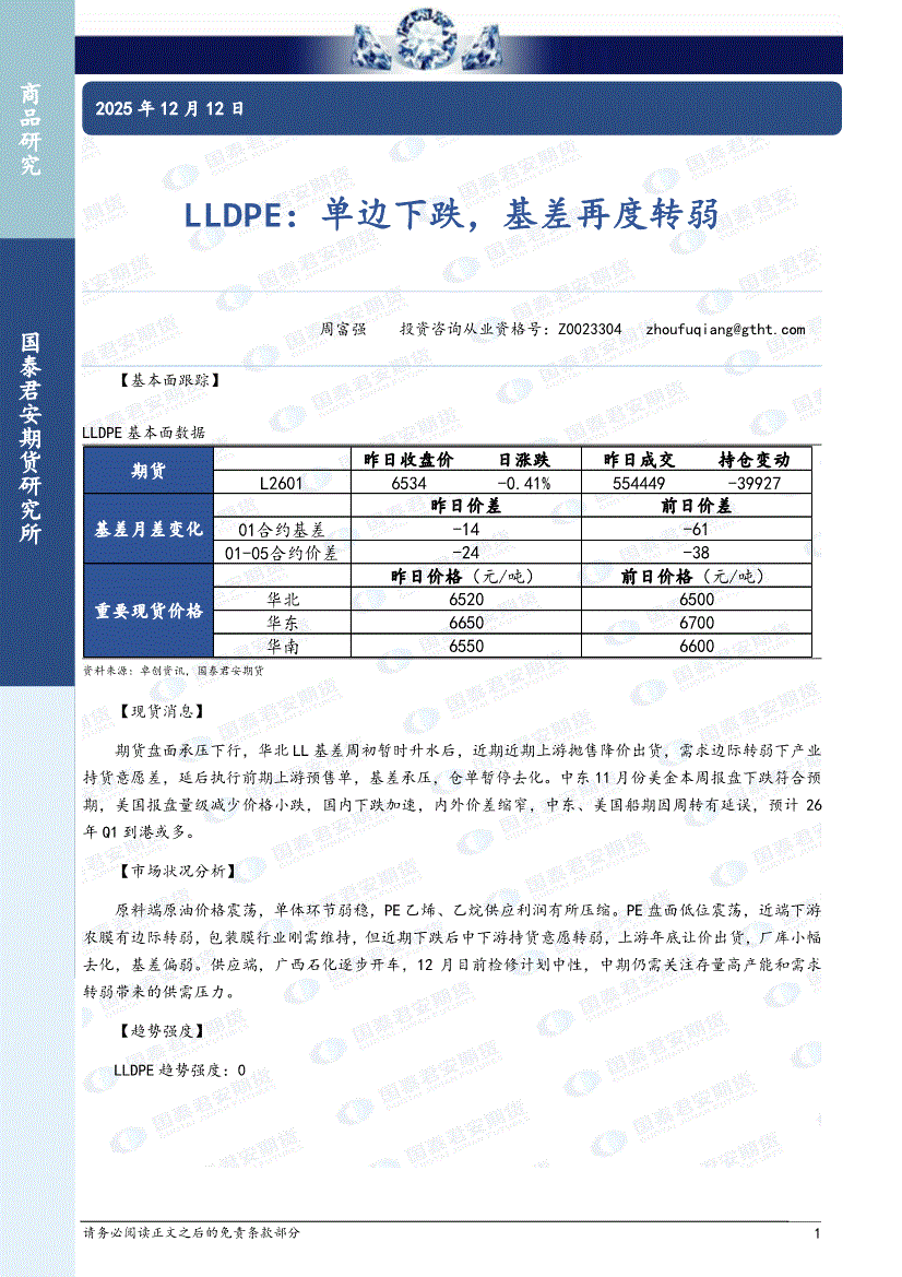 国泰君安期货-LLDPE:单边下跌,基差再度转弱-251211