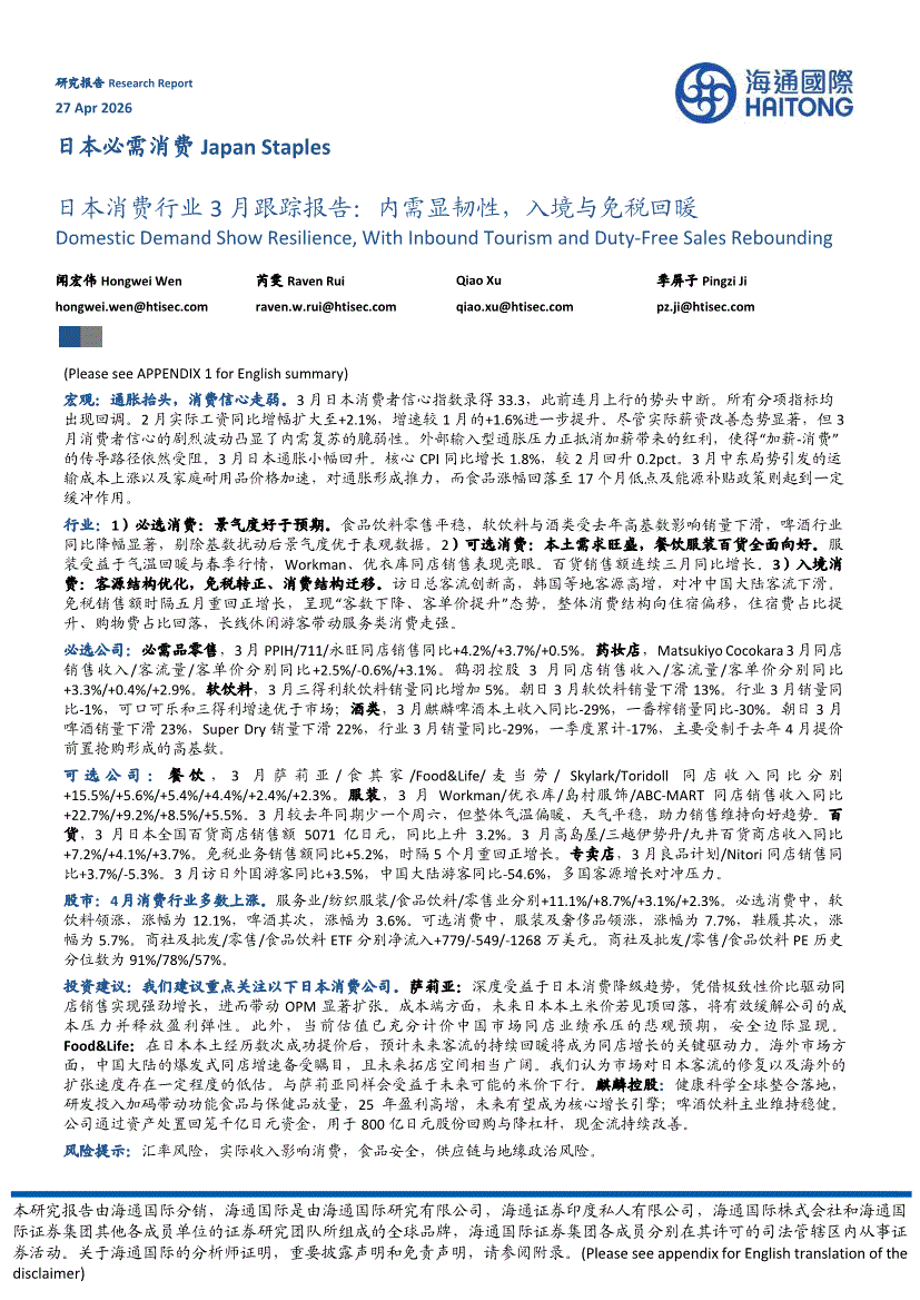 消费行业:海通国际-日本消费行业3月跟踪报告:内需显韧性,入境与免税回暖-260427