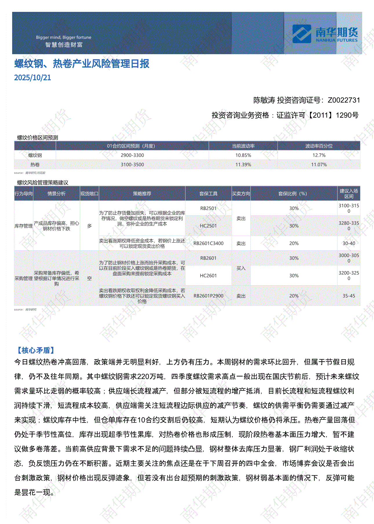 南华期货-螺纹钢、热卷产业风险管理日报-251021