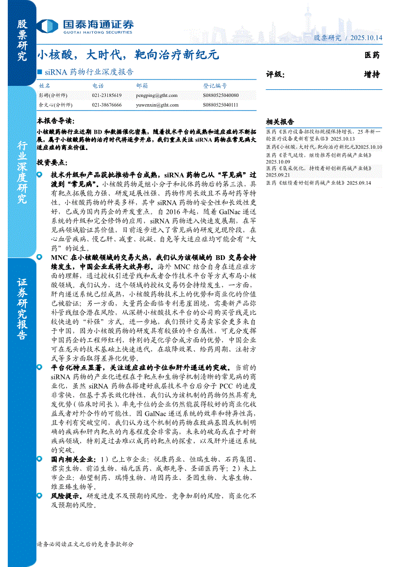 国泰海通证券-siRNA 药物行业深度报告:小核酸,大时代,靶向治疗新纪元-251010