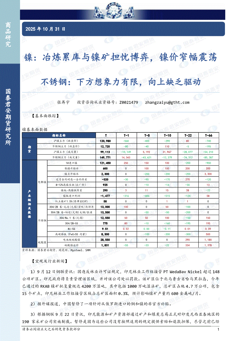国泰君安期货-镍:短线窄幅震荡,矛盾仍在积累,不锈钢,供需难寻上行驱动,成本限制下方空间-251020