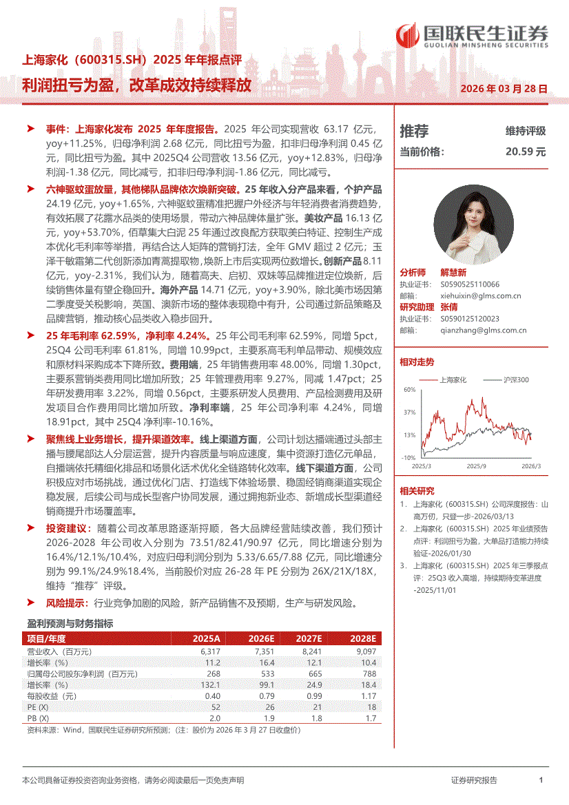 上海家化:国联民生证券-上海家化-600315-2025年年报点评:利润扭亏为盈,改革成效持续释放-260328