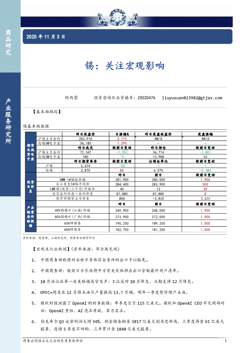 国泰君安期货-锡:关注宏观影响-251103