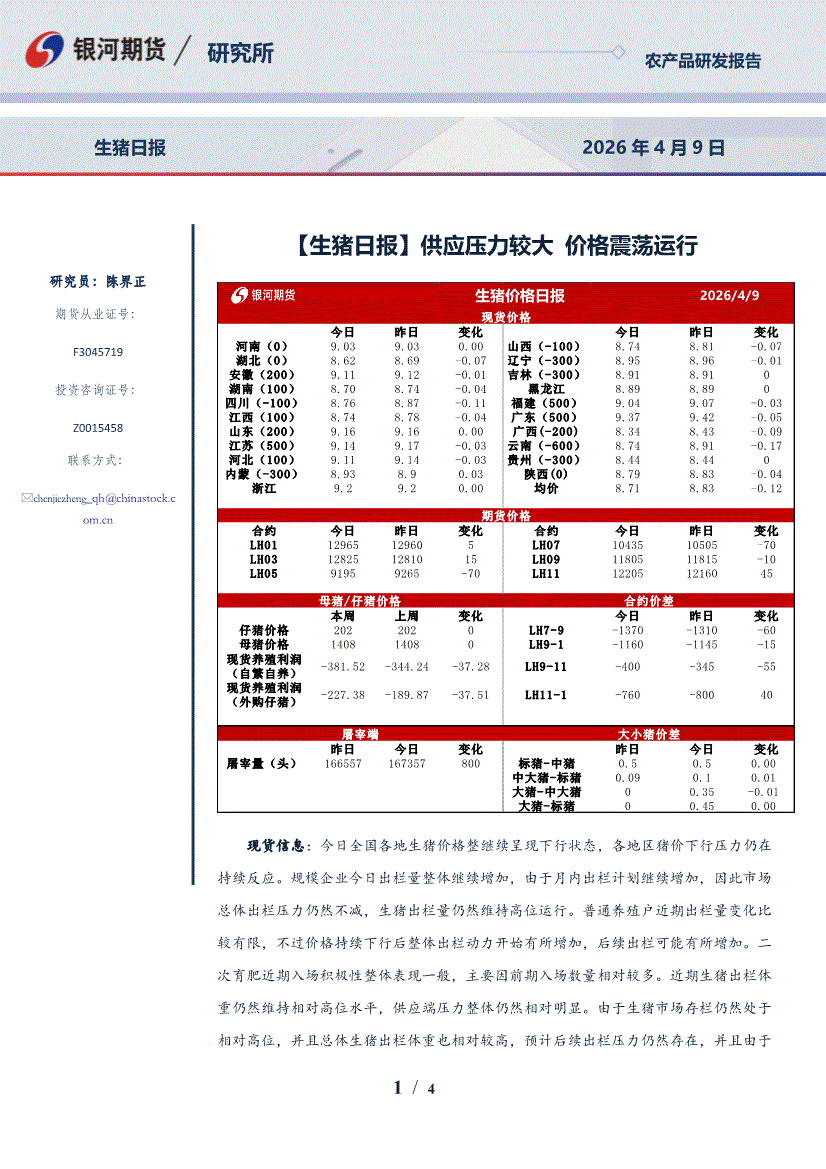 银河期货-【生猪日报】供应压力较大,价格震荡运行-260409