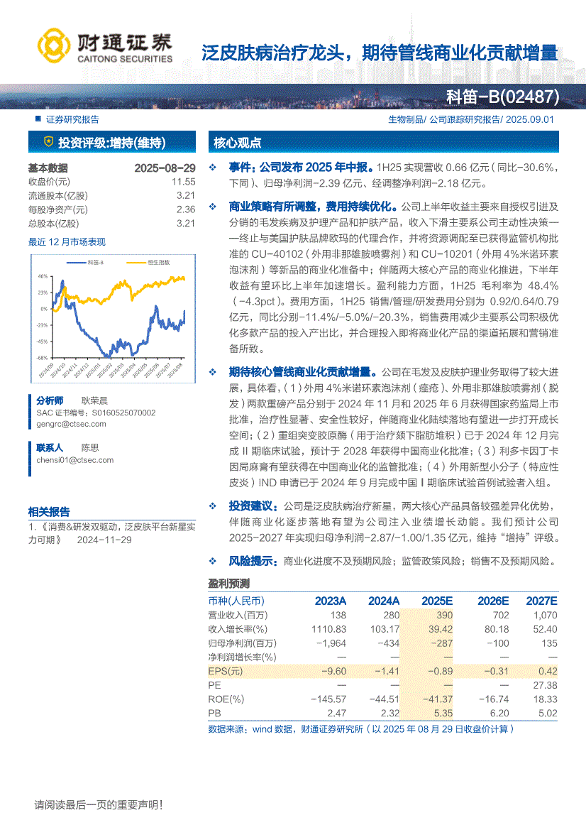 科笛~B:财通证券-科笛~B-2487.HK-泛皮肤病治疗龙头,期待管线商业化贡献增量-250901