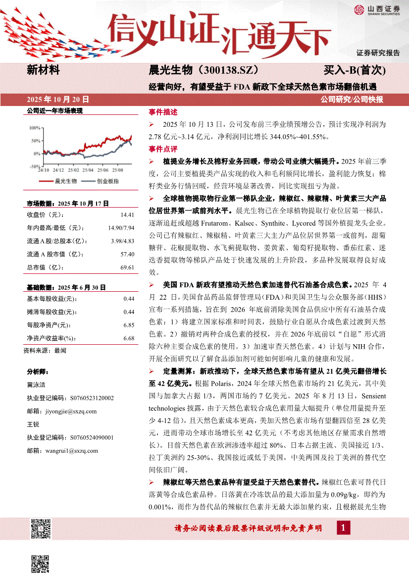 晨光生物:山西证券-晨光生物-300138-经营向好,有望受益于FDA新政下全球天然色素市场翻倍机遇-251020