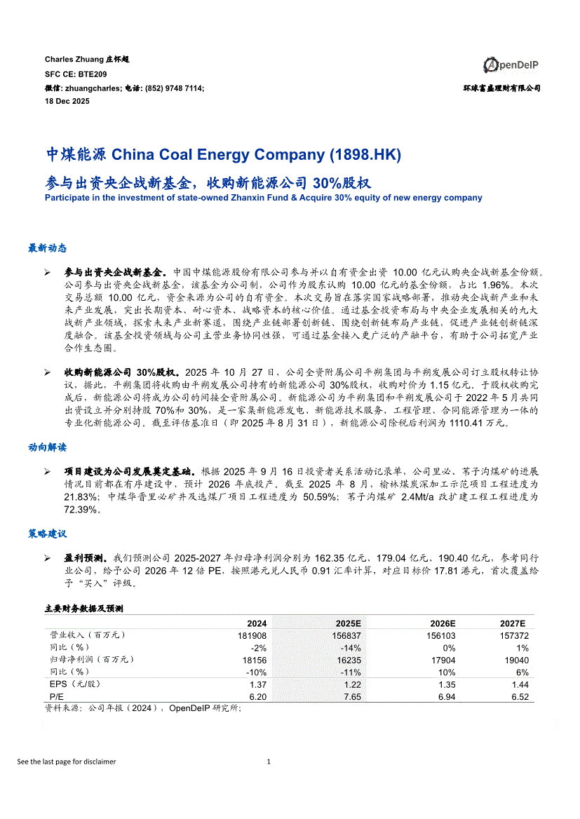 中煤能源:环球富盛-中煤能源-1898.HK-参与出资央企战新基金,收购新能源公司30%股权-251218