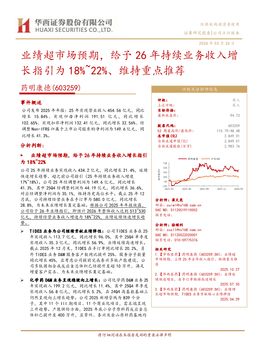 药明康德:华西证券-药明康德-603259-业绩超市场预期,给予26年持续业务收入增长指引为18%~22%、维持重点推荐-260326