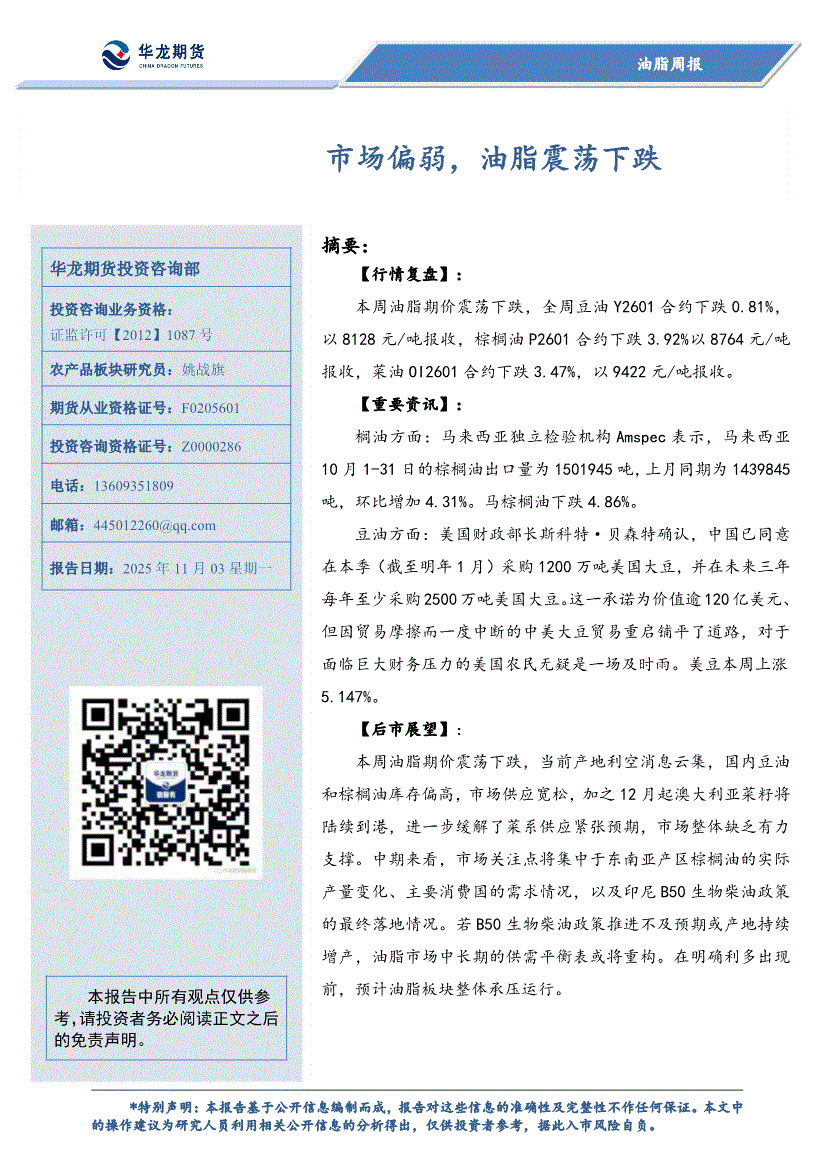 华龙期货-油脂周报:市场偏弱,油脂震荡下跌-251103