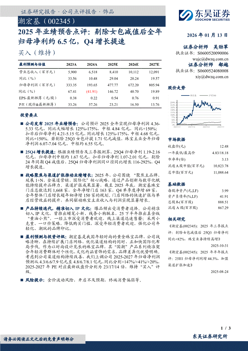 潮宏基:东吴证券-潮宏基-002345-2025年业绩预告点评:剔除女包减值后全年归母净利约6.5亿,Q4增长提速-260113