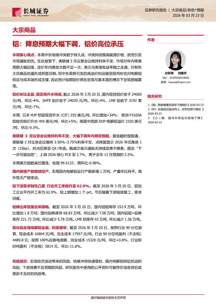 长城证券-大宗商品有色周报:铝,降息预期大幅下调,铝价高位承压-260323