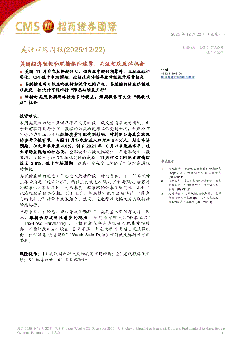 招商证券(香港)-美股市场周报:美国经济数据和联储换帅迷雾,关注超跌反弹机会-251222