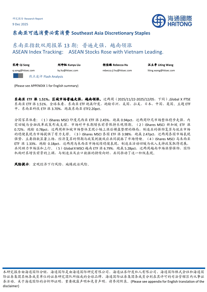 可选消费必需消费行业:海通国际-东南亚可选消费必需消费行业东南亚指数双周报第13期:普遍走强,越南领涨-251209