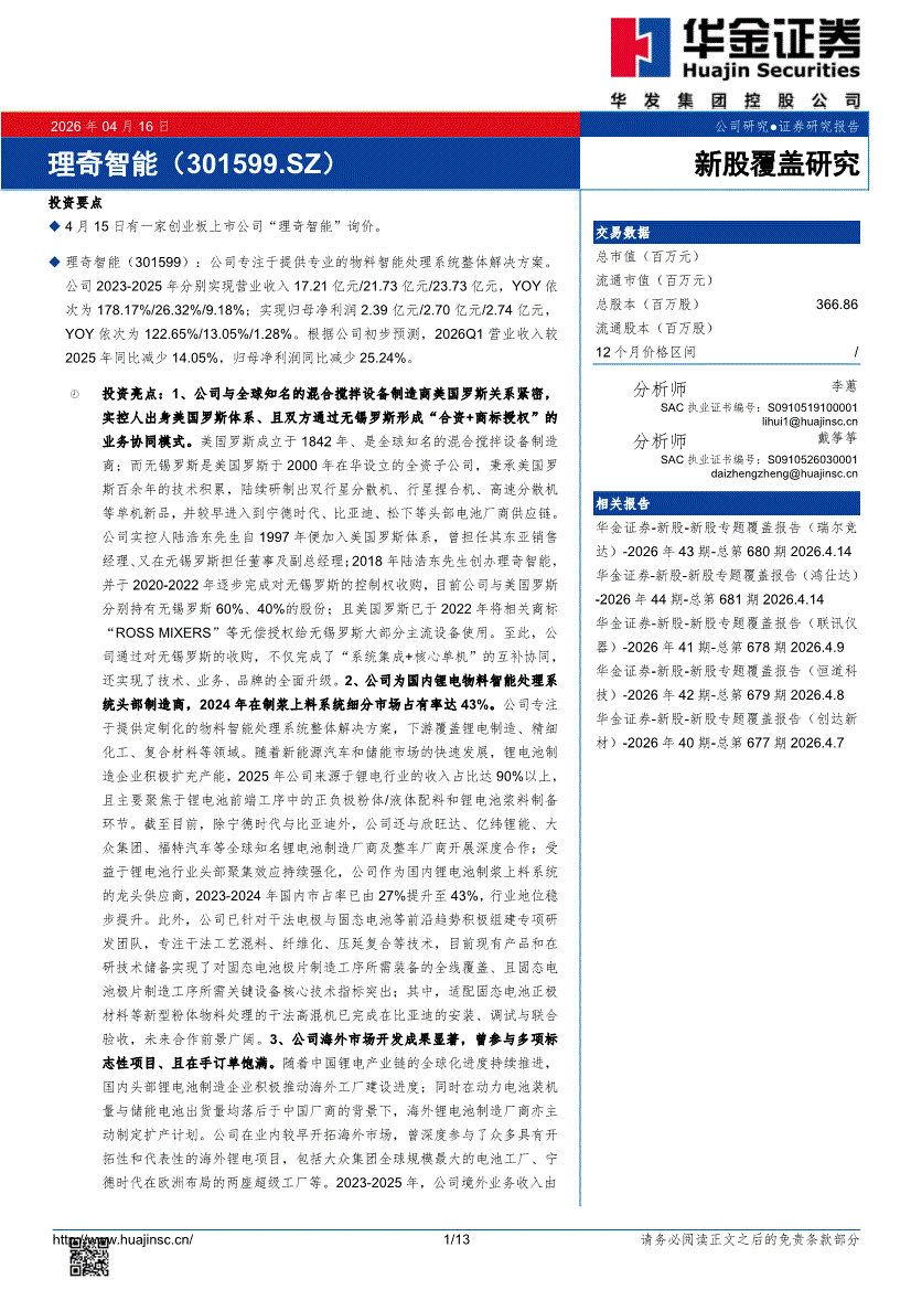 理奇智能:华金证券-理奇智能-301599-新股覆盖研究-260416