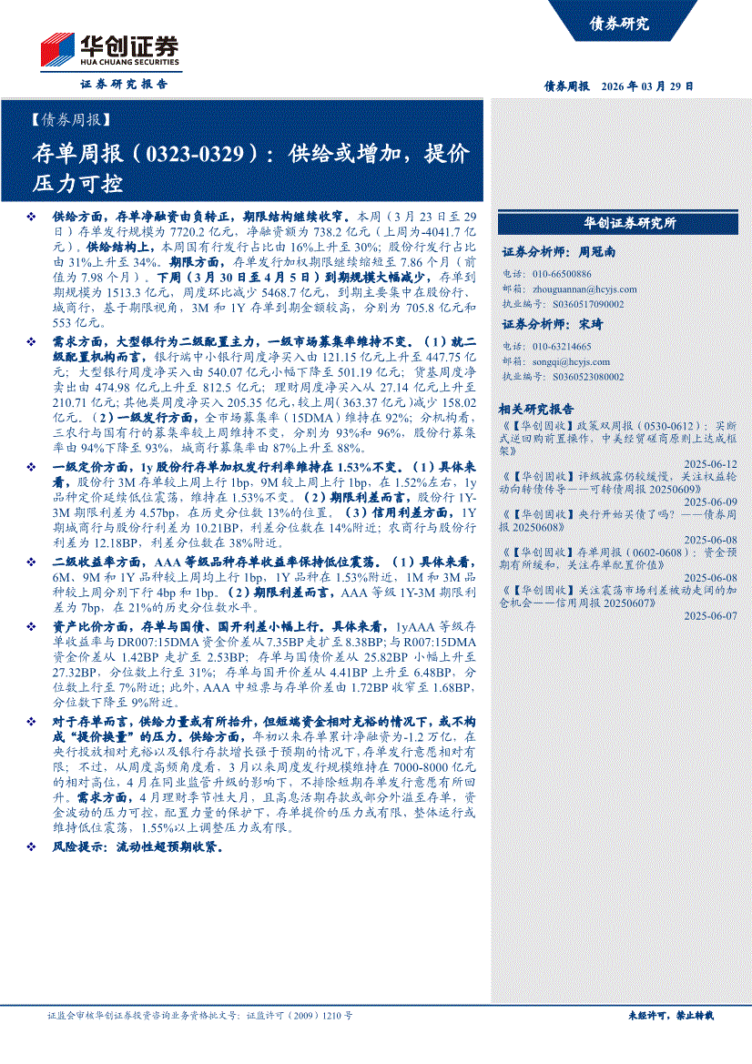 华创证券-【债券周报】存单周报(0323~0329):供给或增加,提价压力可控-260329