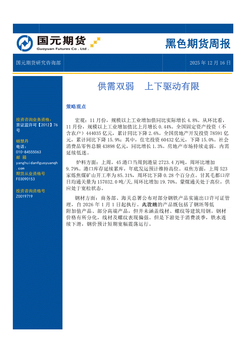 国元期货-黑色期货周报:供需双弱,上下驱动有限-251216