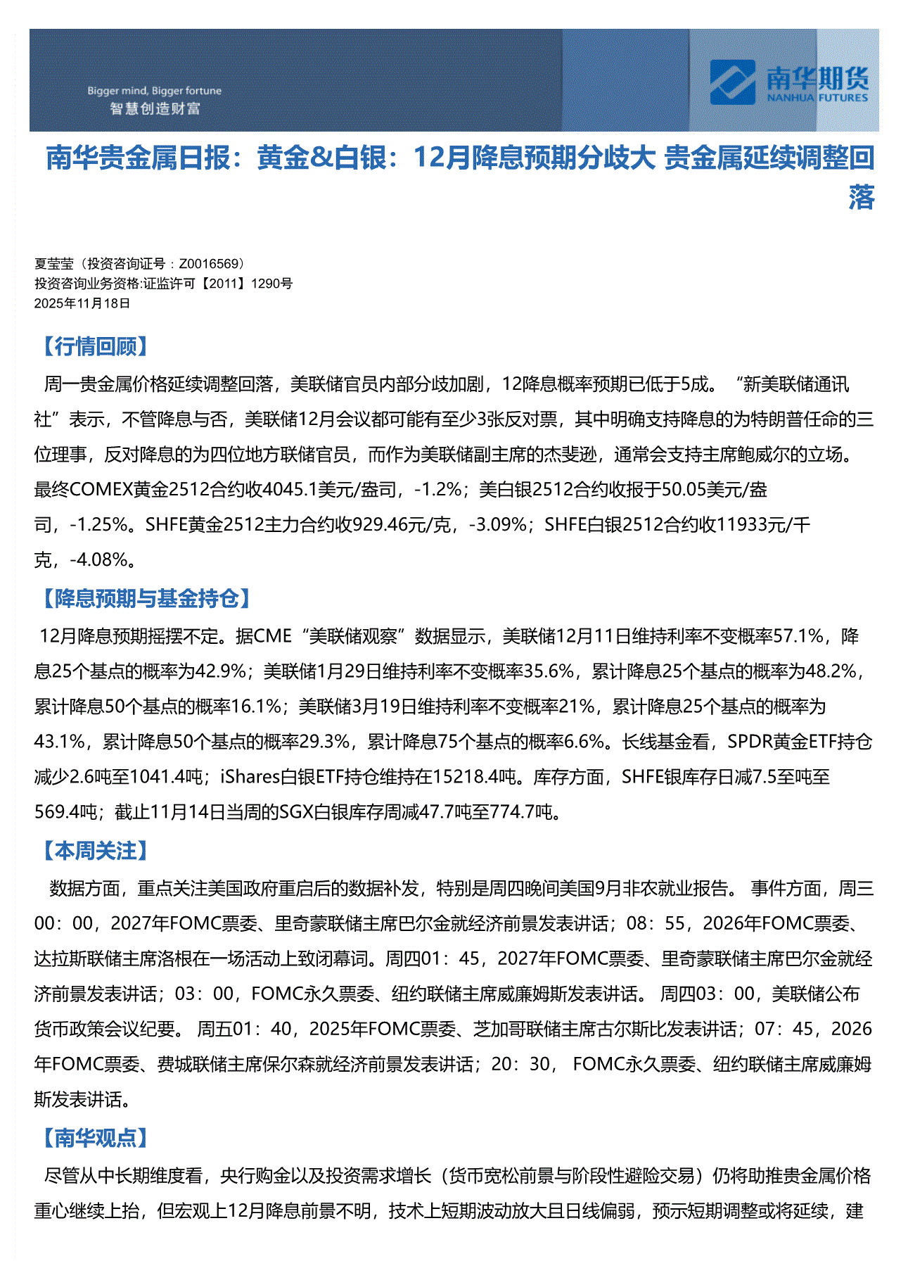 南华期货-贵金属日报:黄金&白银,12月降息预期分歧大,贵金属延续调整回落-251118
