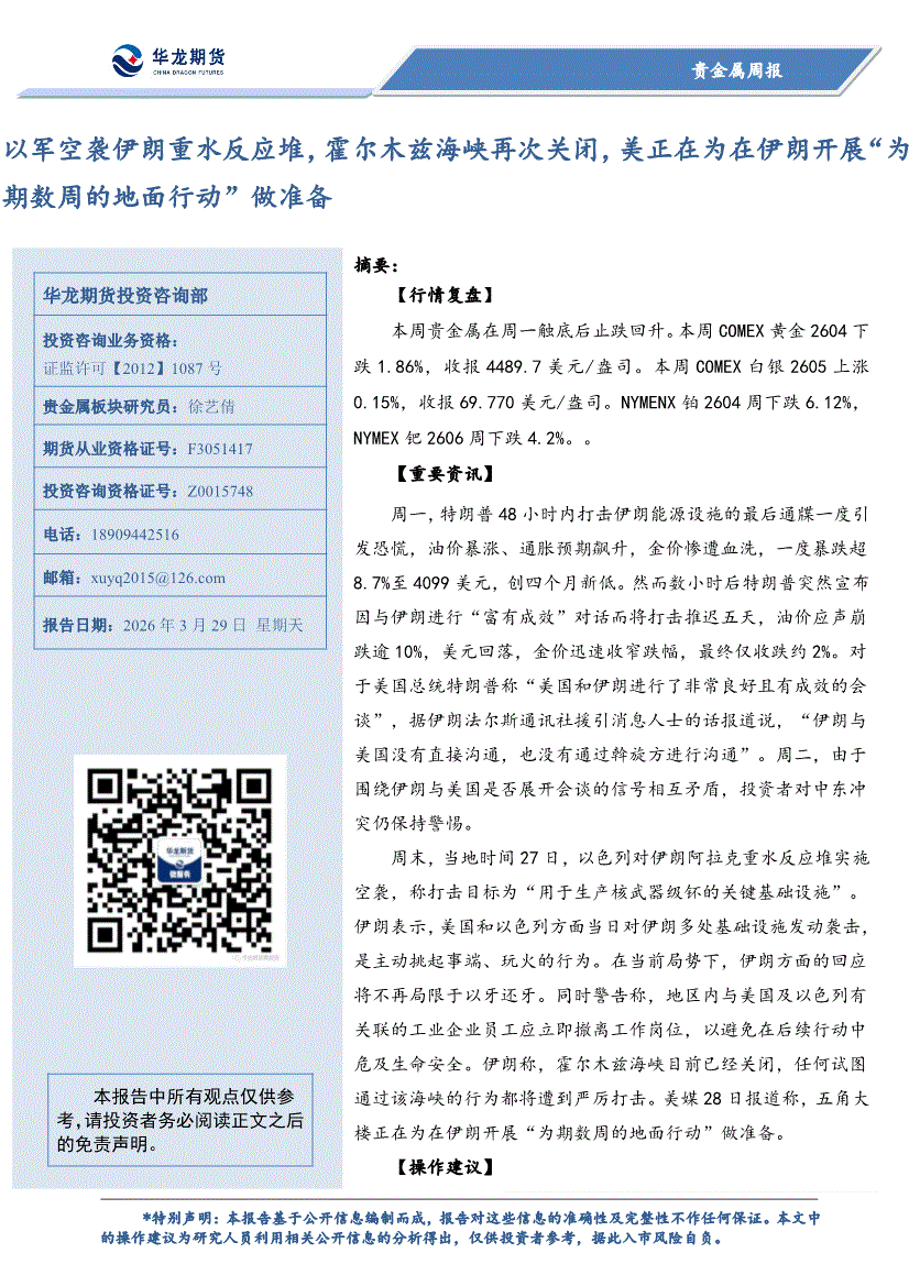 华龙期货-贵金属周报:以军空袭伊朗重水反应堆,霍尔木兹海峡再次关闭,美正在为在伊朗开展“为期数周的地面行动”做准备-260329