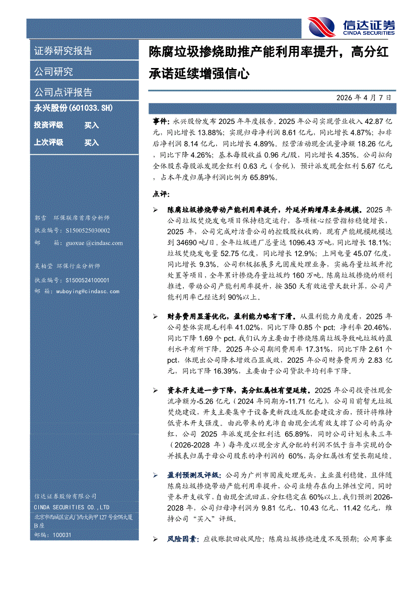 永兴股份:信达证券-永兴股份-601033-陈腐垃圾掺烧助推产能利用率提升,高分红承诺延续增强信心-260407