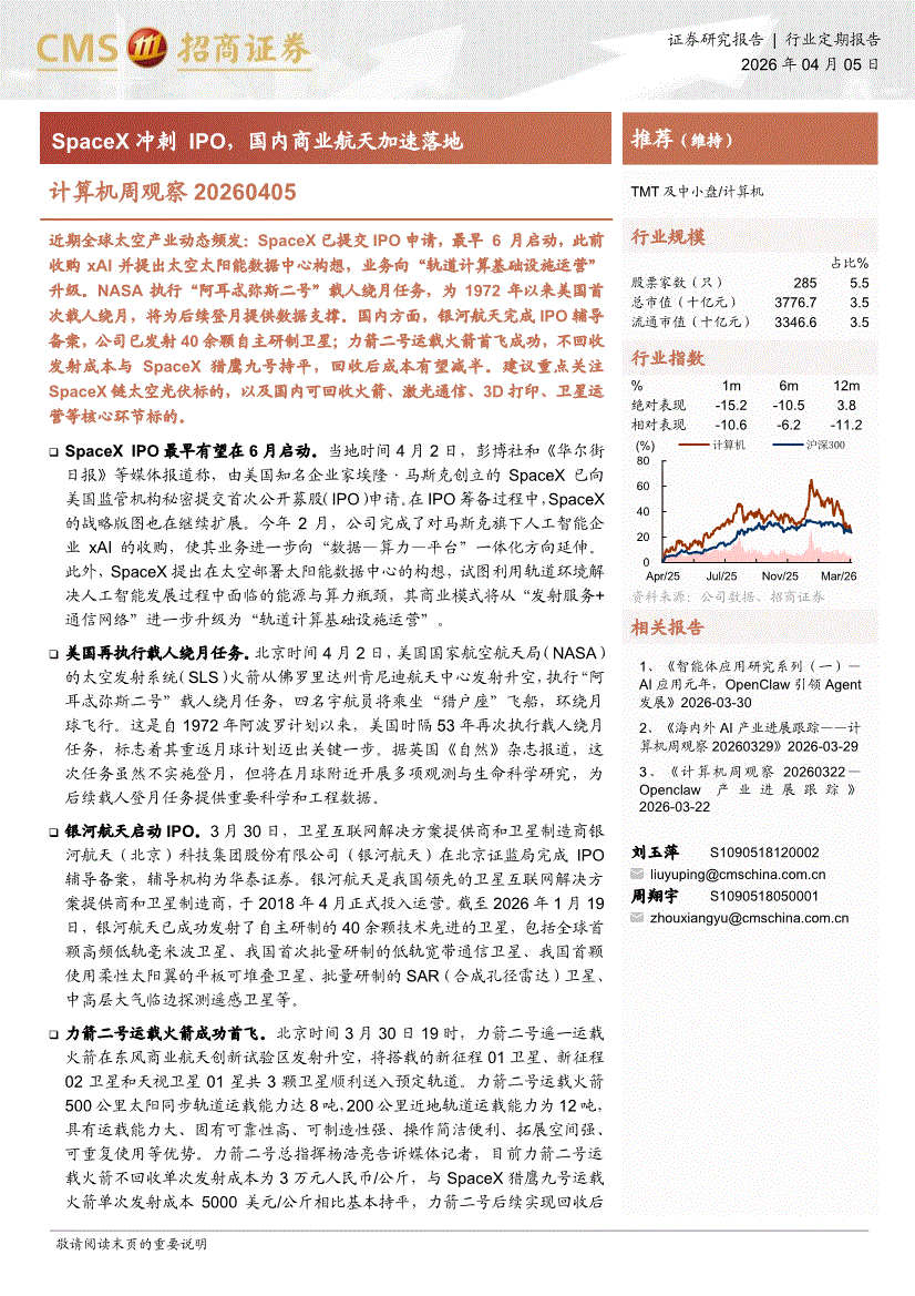 计算机行业:招商证券-计算机行业周观察:SpaceX冲刺IPO,国内商业航天加速落地-260405