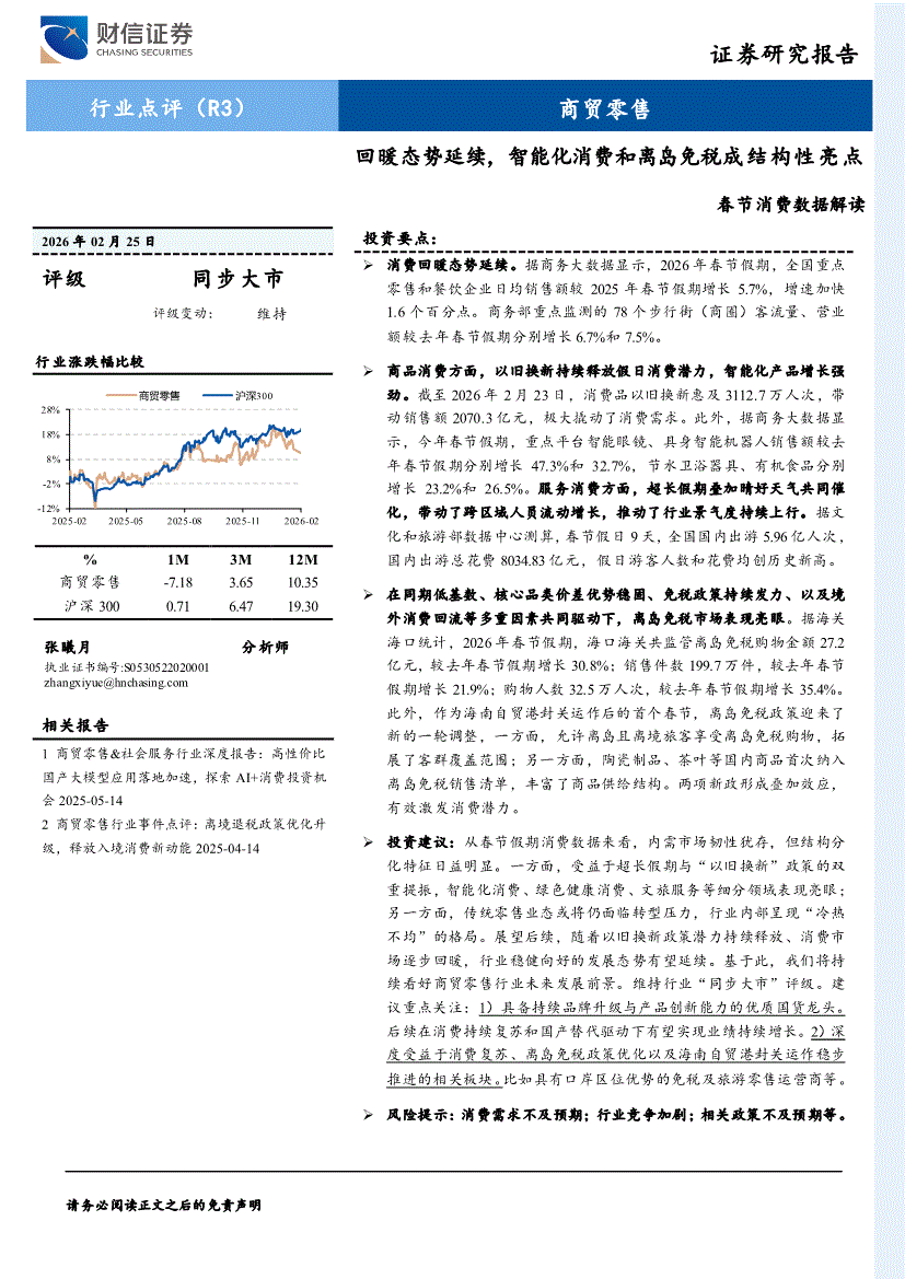商贸零售行业:财信证券-商贸零售行业春节消费数据解读:回暖态势延续,智能化消费和离岛免税成结构性亮点-260225
