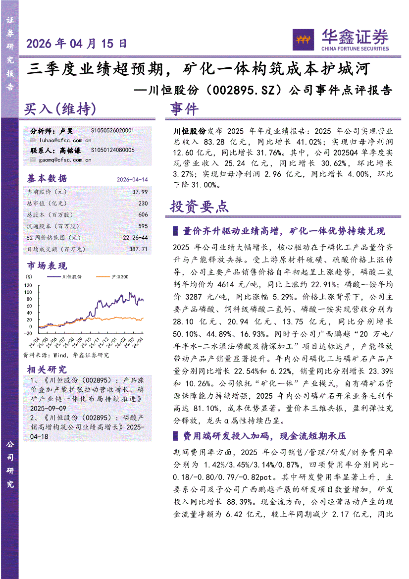 川恒股份:华鑫证券-川恒股份-002895-公司事件点评报告:三季度业绩超预期,矿化一体构筑成本护城河-260415