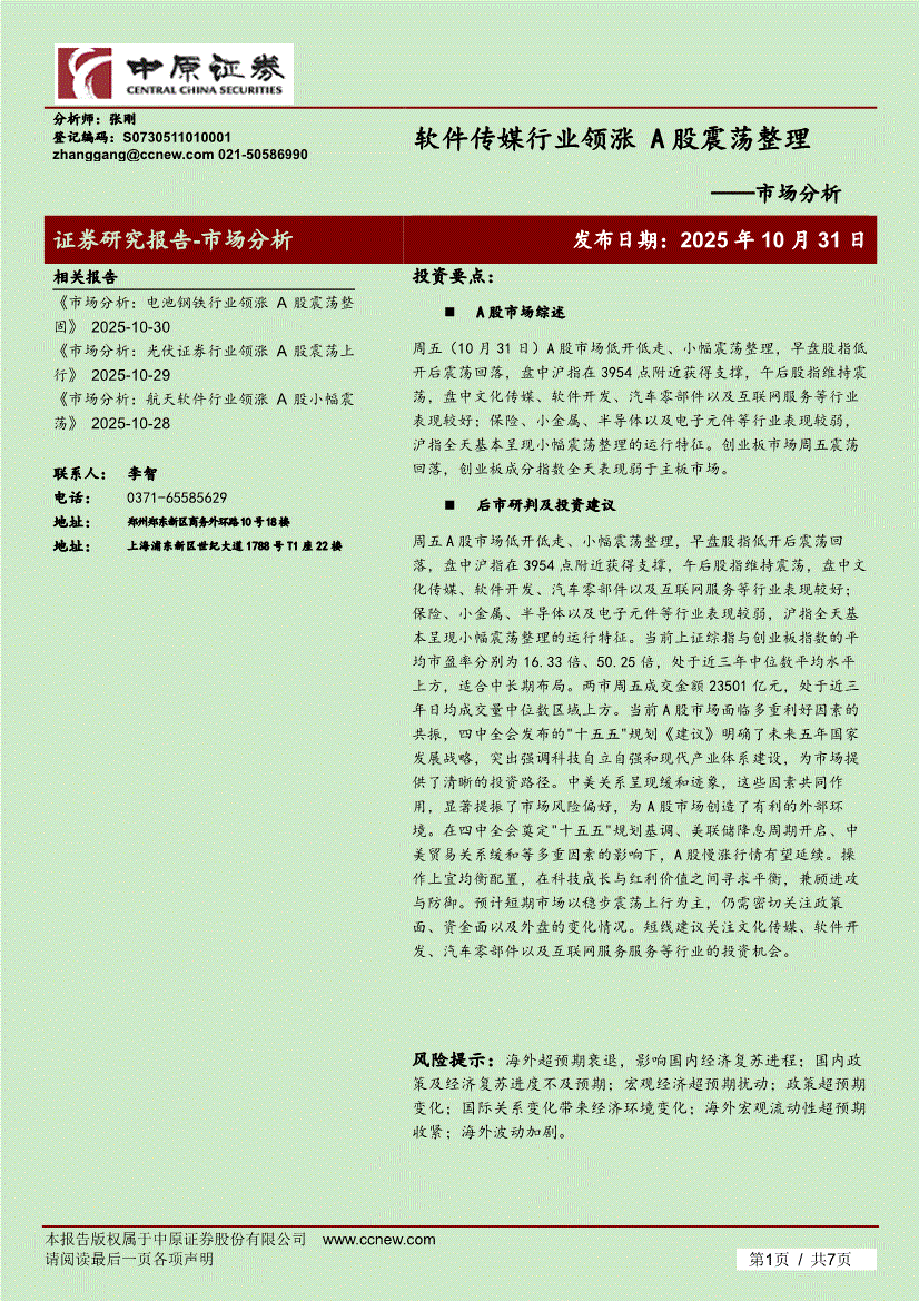 中原证券-市场分析:软件传媒行业领涨,A股震荡整理-251031
