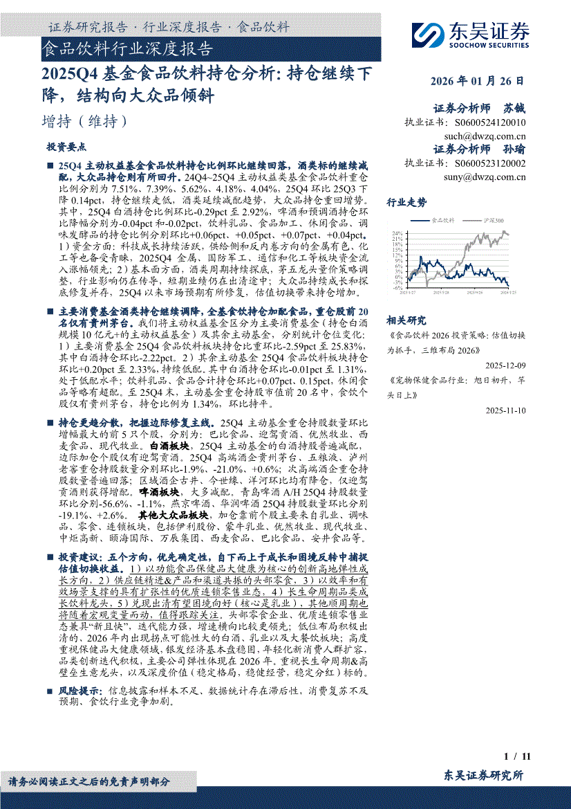 食品饮料行业:东吴证券-食品饮料行业深度报告:2025Q4基金食品饮料持仓分析,持仓继续下降,结构向大众品倾斜-260126