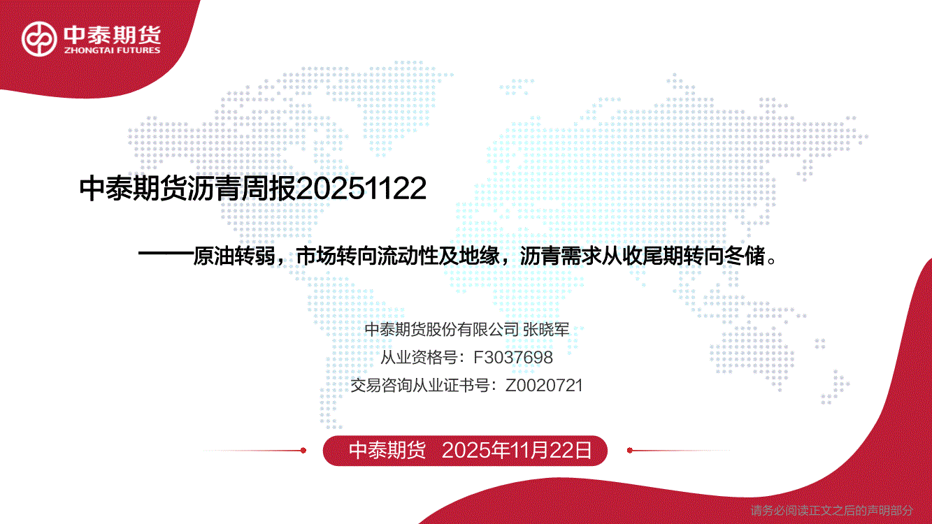 中泰期货-沥青周报:原油转弱,市场转向流动性及地缘,沥青需求从收尾期转向冬储-251122