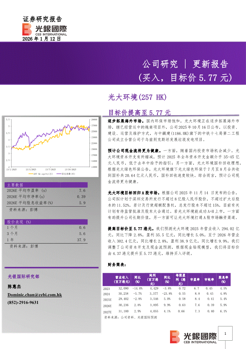光大环境:光银国际-光大环境-0257.HK-更新报告:目标价提高至5.77元-260112