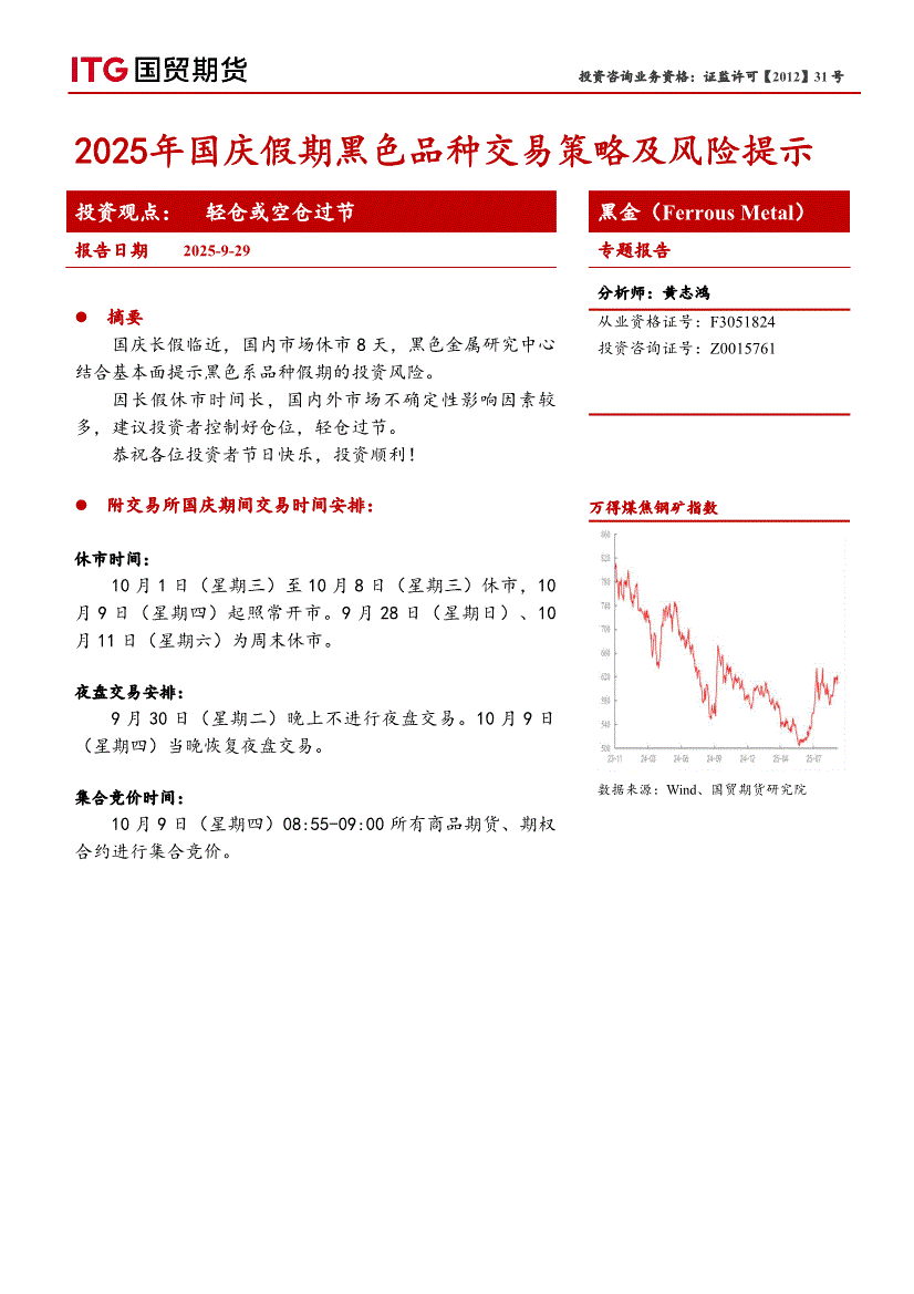 国贸期货-黑金(Ferrous Metal)专题报告:2025年国庆假期黑色品种交易策略及风险提示-250929