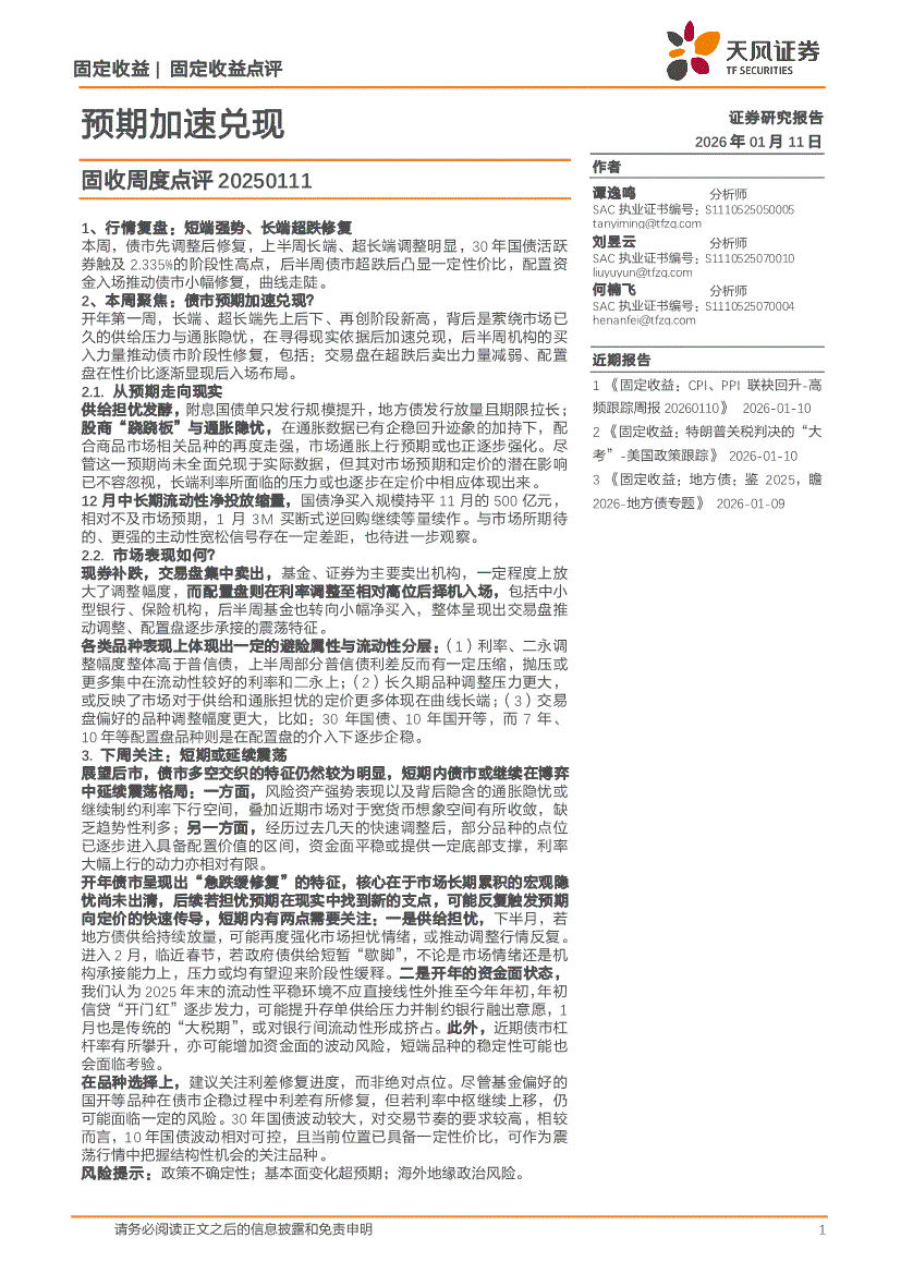 天风证券-固收周度点评:预期加速兑现-260111