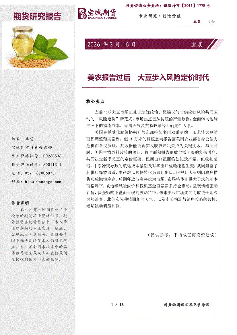 宝城期货-豆类报告:美农报告过后大豆步入风险定价时代-260317