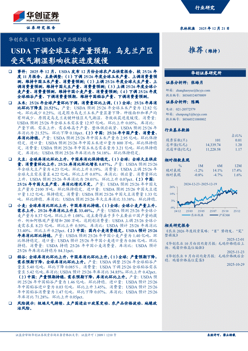 农业:华创证券-农业12月USDA农产品跟踪报告:USDA下调全球玉米产量预测,乌克兰产区受天气潮湿影响收获进度缓慢-251221
