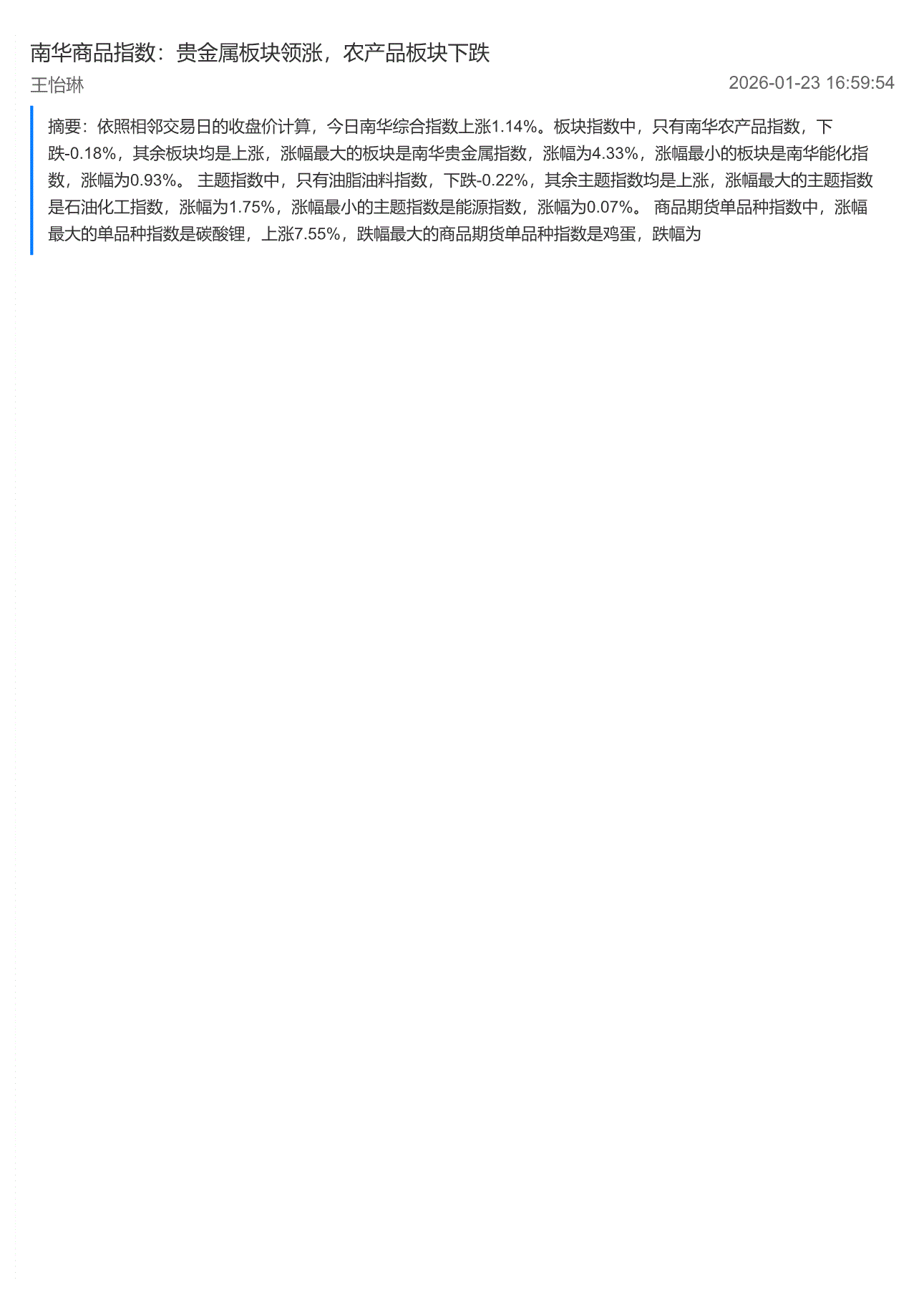 南华期货-商品指数:贵金属板块领涨,农产品板块下跌-260123