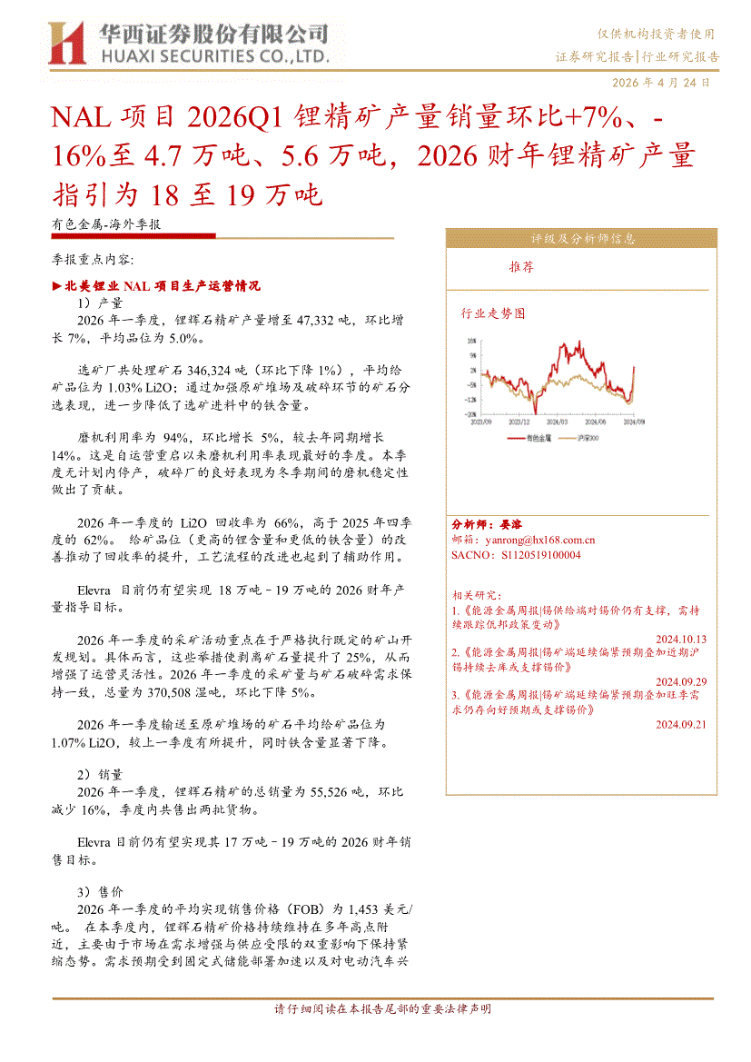 有色金属行业:华西证券-有色金属行业~海外季报:NAL项目2026Q1锂精矿产量销量环比+7%、下降16%至4.7万吨、5.6万吨,2026财年锂精矿产量指引为18至19万吨-260424