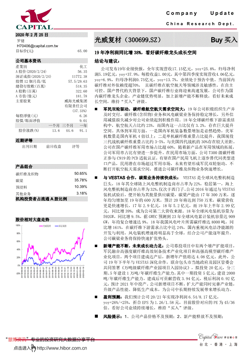 光威复材研究报告:群益证券-光威复材-300699-19年净利润同比增38%,看好碳纤维龙头成长空间-200225