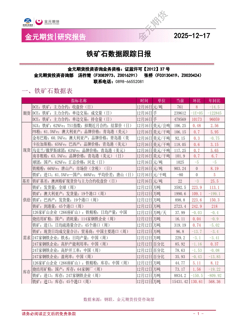 金元期货-螺纹钢产业链数据跟踪日报-251217