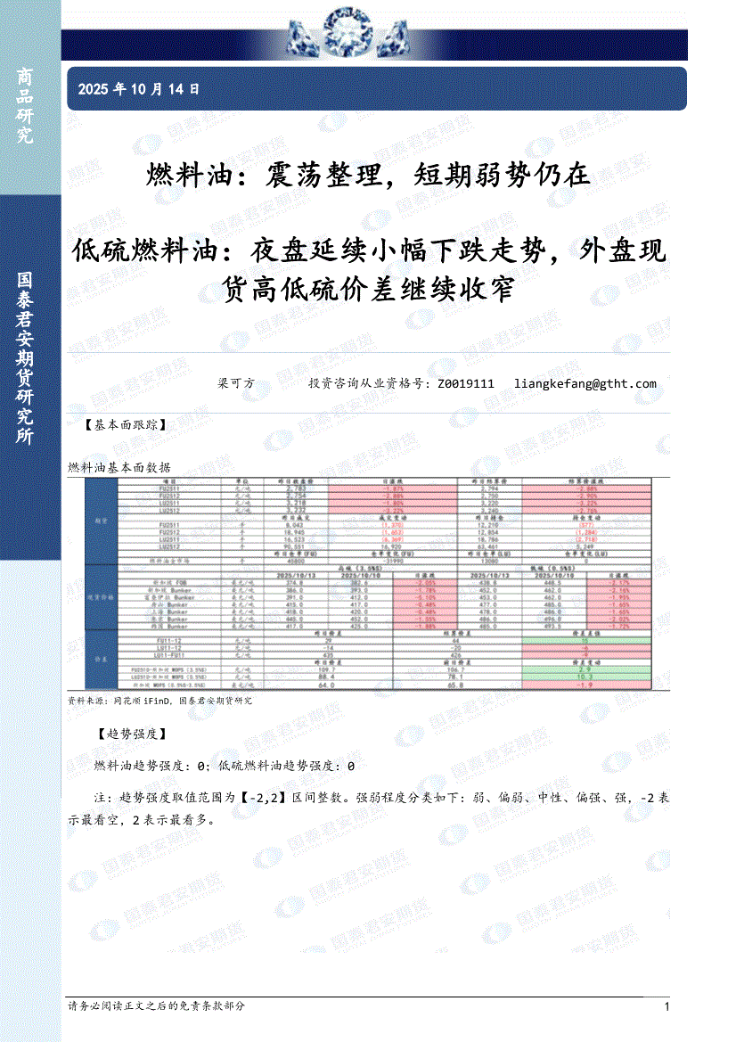 国泰君安期货-燃料油:震荡整理,短期弱势仍在,低硫燃料油,夜盘延续小幅下跌走势,外盘现货高低硫价差继续收窄-251014