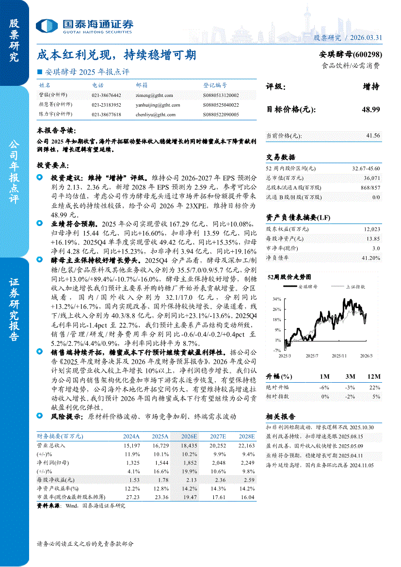 安琪酵母:国泰海通证券-安琪酵母-600298-2025年报点评:成本红利兑现,持续稳增可期-260331