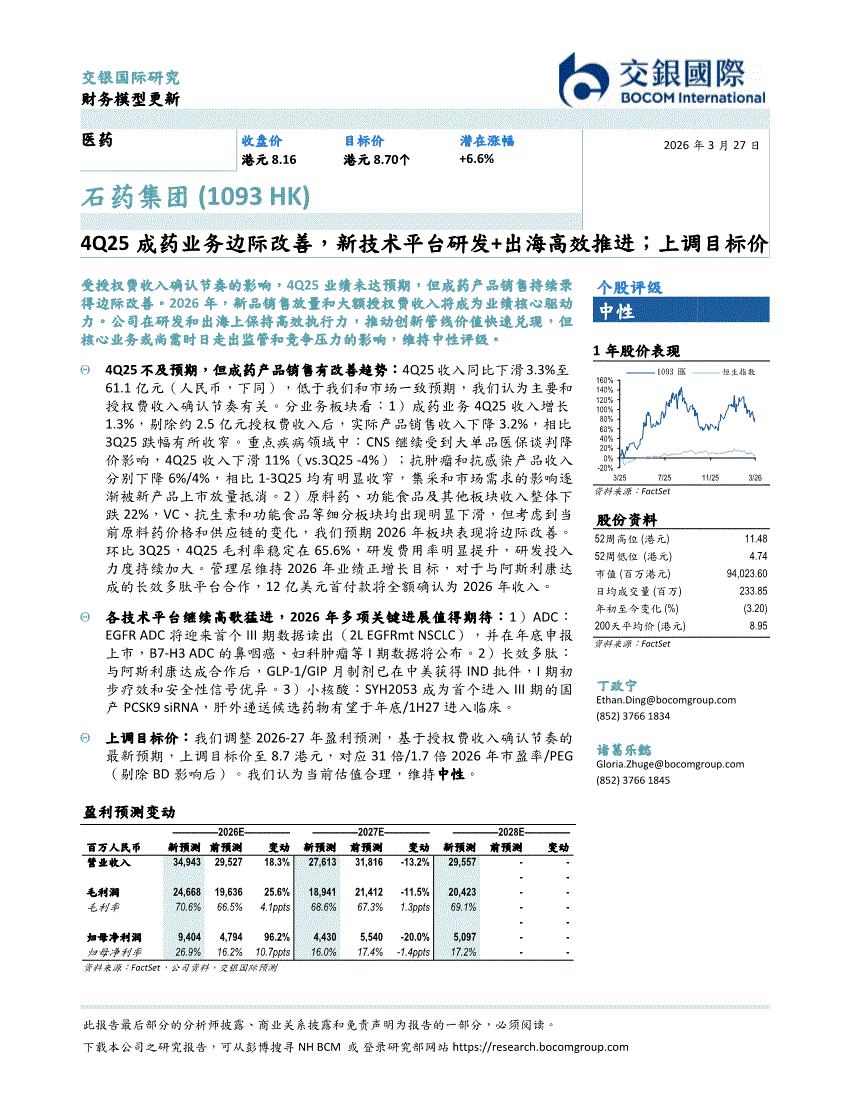 石药集团:交银国际-石药集团-1093.HK-4Q25成药业务边际改善,新技术平台研发+出海高效推进;上调目标价-260327