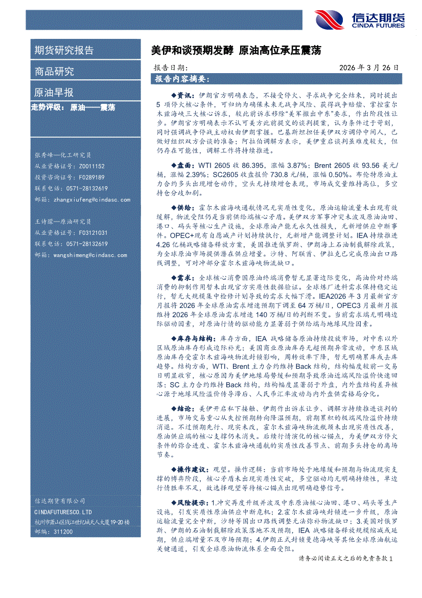 信达期货-原油早报:美伊和谈预期发酵,原油高位承压震荡-260326
