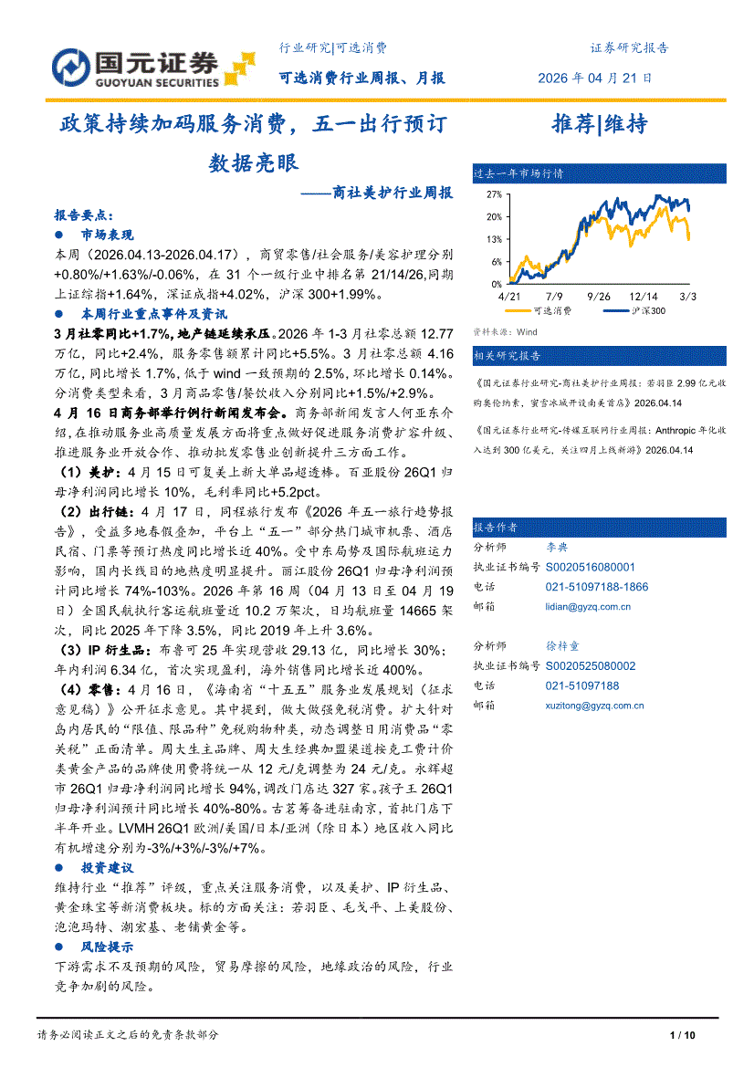 商社美护行业:国元证券-商社美护行业周报:政策持续加码服务消费,五一出行预订数据亮眼-260421