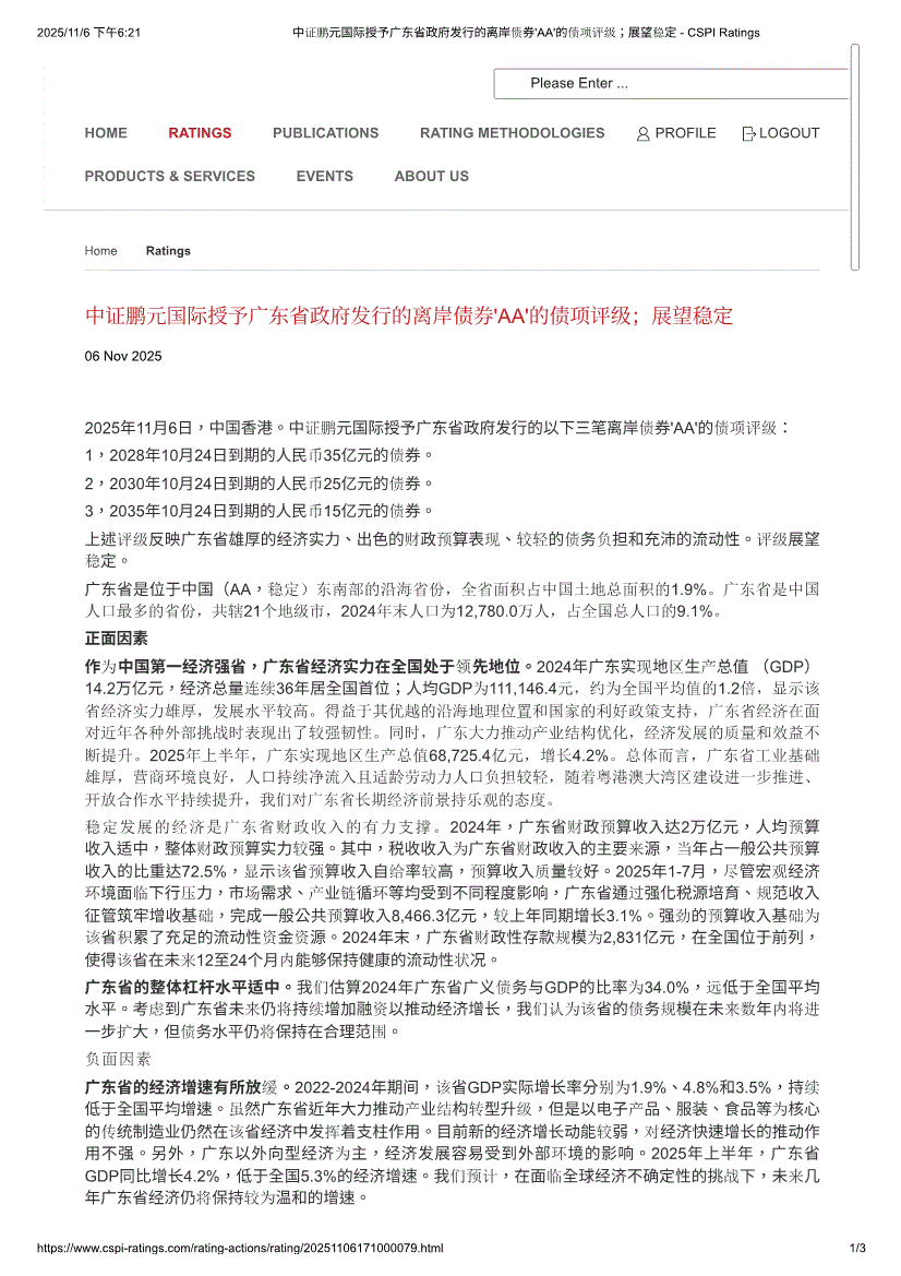鹏元国际-授予广东省政府发行的离岸债券'AA'的债项评级;展望稳定-251106
