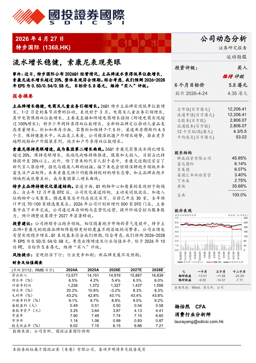 特步国际:国投证券(香港)-特步国际-1368.HK-流水增长稳健,索康尼表现亮眼-260427