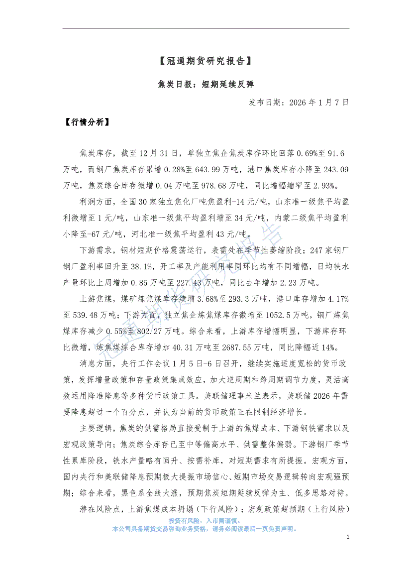 冠通期货-焦炭日报:短期延续反弹为主-260115