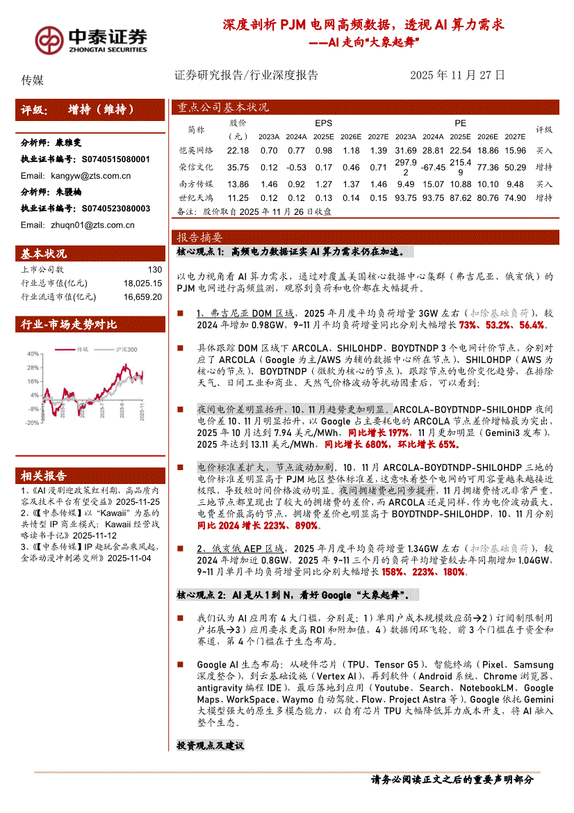 传媒行业:中泰证券-传媒行业AI走向“大象起舞”:深度剖析PJM电网高频数据,透视AI算力需求-251127