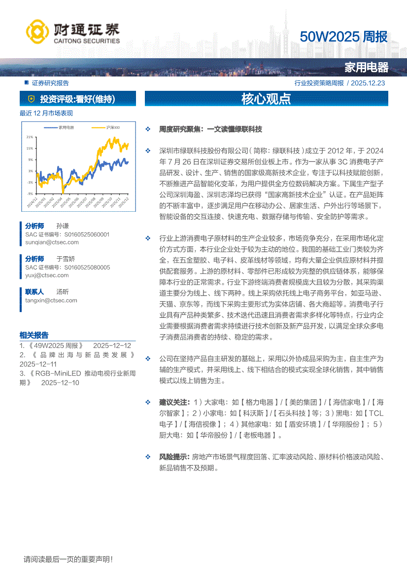 家用电器行业:财通证券-家用电器行业50W2025周报-251223