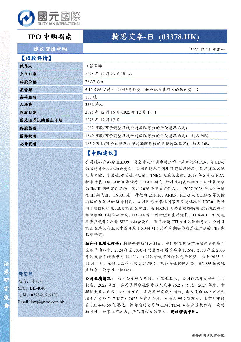 翰思艾泰~B:国元国际-翰思艾泰~B-3378.HK-IPO申购指南-251215